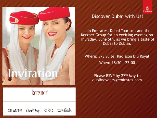Join Emirates, Dubai Tourism and the Kerzner Group for an exciting evening on Thursday, June 5th, as we bring a taste of Dubai to Dublin. Please RSVP by 27th May to [email protected]