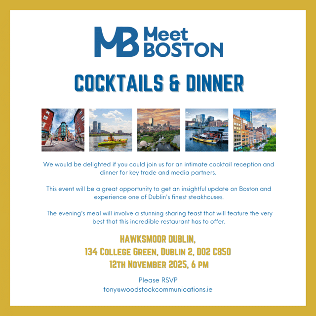 Intimate cocktail reception and dinner at Hawksmoor Dublin on 12th November 2025 at 6pm. This event will be a great opportunity to get an insightful update on Boston and experience one of Dublin's finest steakhouses. Invite Only.