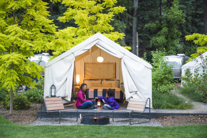 AutoCamp is a luxury tent hotel in multiple locations including Joshua Tree or outside Yosemite National Park. Several of the sleek, vintage trailers are fully outfitted, with a little deck, a gadget-filled kitchen, and cosy quilts for snuggling. In Sonoma, visitors can walk down to the Russian River to swim or canoe, play lawn games, or lounge by a fire pit inside or outside the mid-century-modern-style clubhouse.