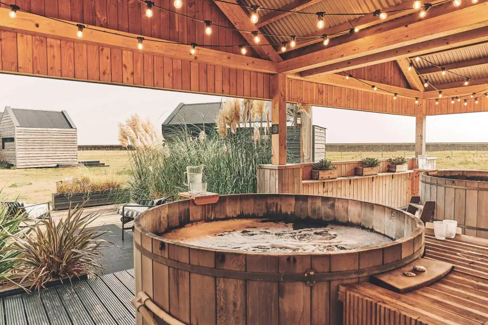 And then there were the hot tubs. Tucked beside the cabins, surrounded by trees, they became our evening ritual. Glasses of Prosecco in hand, steam rising into the cool night air, we soaked beneath the stars while the forest hummed quietly around us.