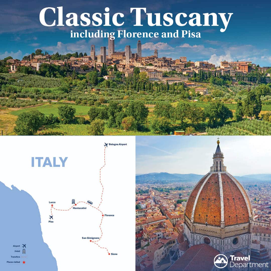 Or for a different take on the Italian dream, set your sights on mesmerizing Tuscany, where the only thing better than the scenery is the food. Visit the capital of the Renaissance on a day trip to Florence, including stops at the Duomo & Ponte Vecchio. Visit the Leaning Tower in Pisa and enjoy leisure time in Lucca, the birthplace of renowned composer Puccini. With so much to offer, Italy is just waiting to be discovered.