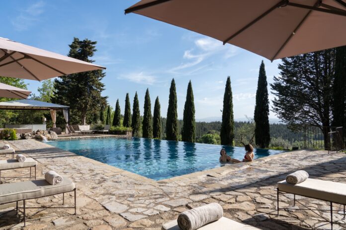 Guests can enjoy panoramic views of the surrounding vineyards and rolling hills, allowing the natural beauty of the Chianti region to become an integral part of their stay. Every suite features tasteful furnishings, exquisite linens, and thoughtfully designed spaces with outstanding pieces of modern art – all sourced from artists based within 10 miles of the villa, overall inspiring a feeling of “home”.