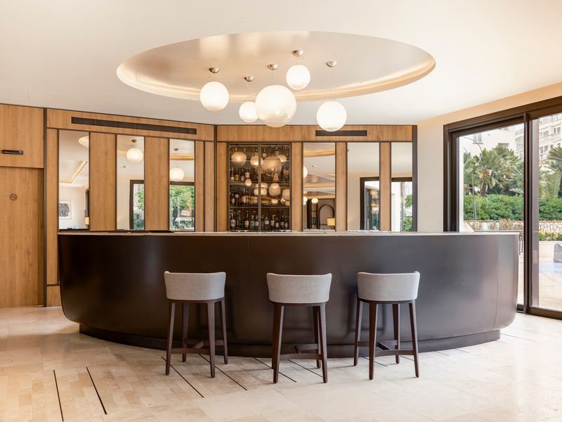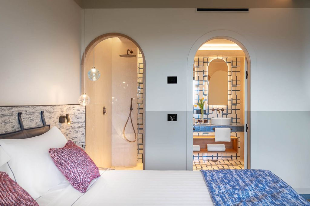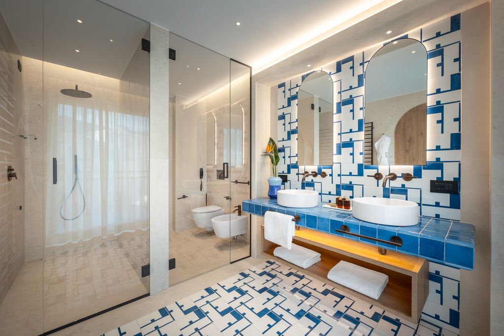 Italian craftsmanship is central throughout: handmade ceramics by Giovanni De Maio, matte nautical-inspired woods by Listone Giordano, custom furniture by Molteni, lighting by Panzeri, and a “proper spa” equipped with Technogym technology. Bronze detailing, natural stone flooring and blue ceramic installations lend warmth and tactility, while imperfections are embraced as part of the hotel’s material honesty.