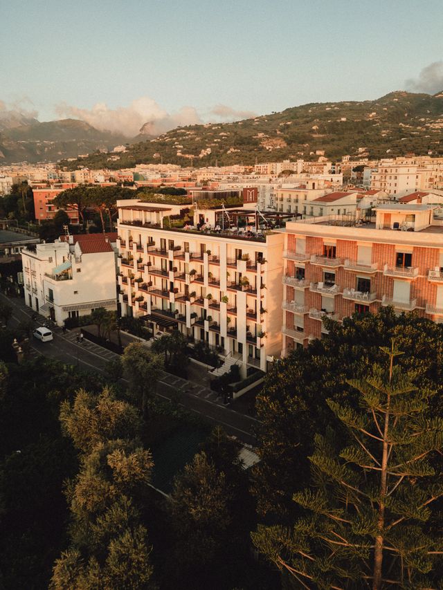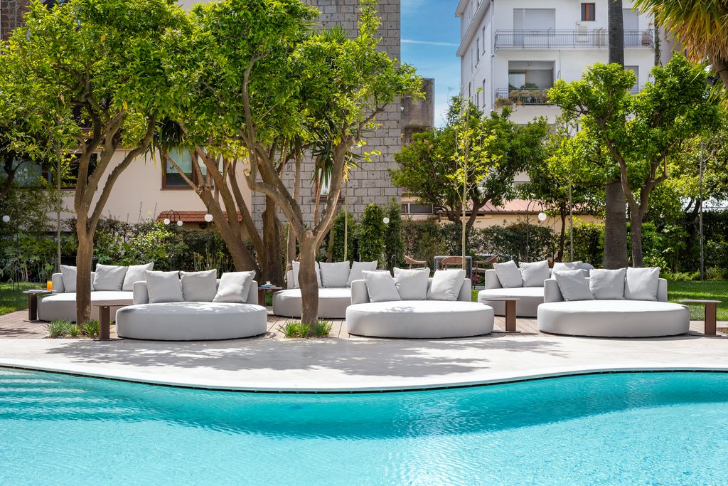 At the heart of the property lies an elliptical swimming pool set within nearly 2,000 square metres of gardens — a rare, tranquil oasis in central Sorrento. A rooftop sky bar crowns the hotel, framing uninterrupted views across the Gulf and delivering one of the area’s most atmospheric sunset settings.