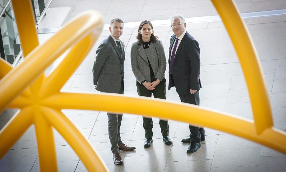 Above are Andrew Hetherington, Chief Executive, Business to Arts; Sarah Glennie, Director, NCAD; and Vincent Harrison, Managing Director, Dublin Airport, at the launch of Creative Journeys and seen through Isabel Nolan’s Turning Point sculpture in Terminal 2.