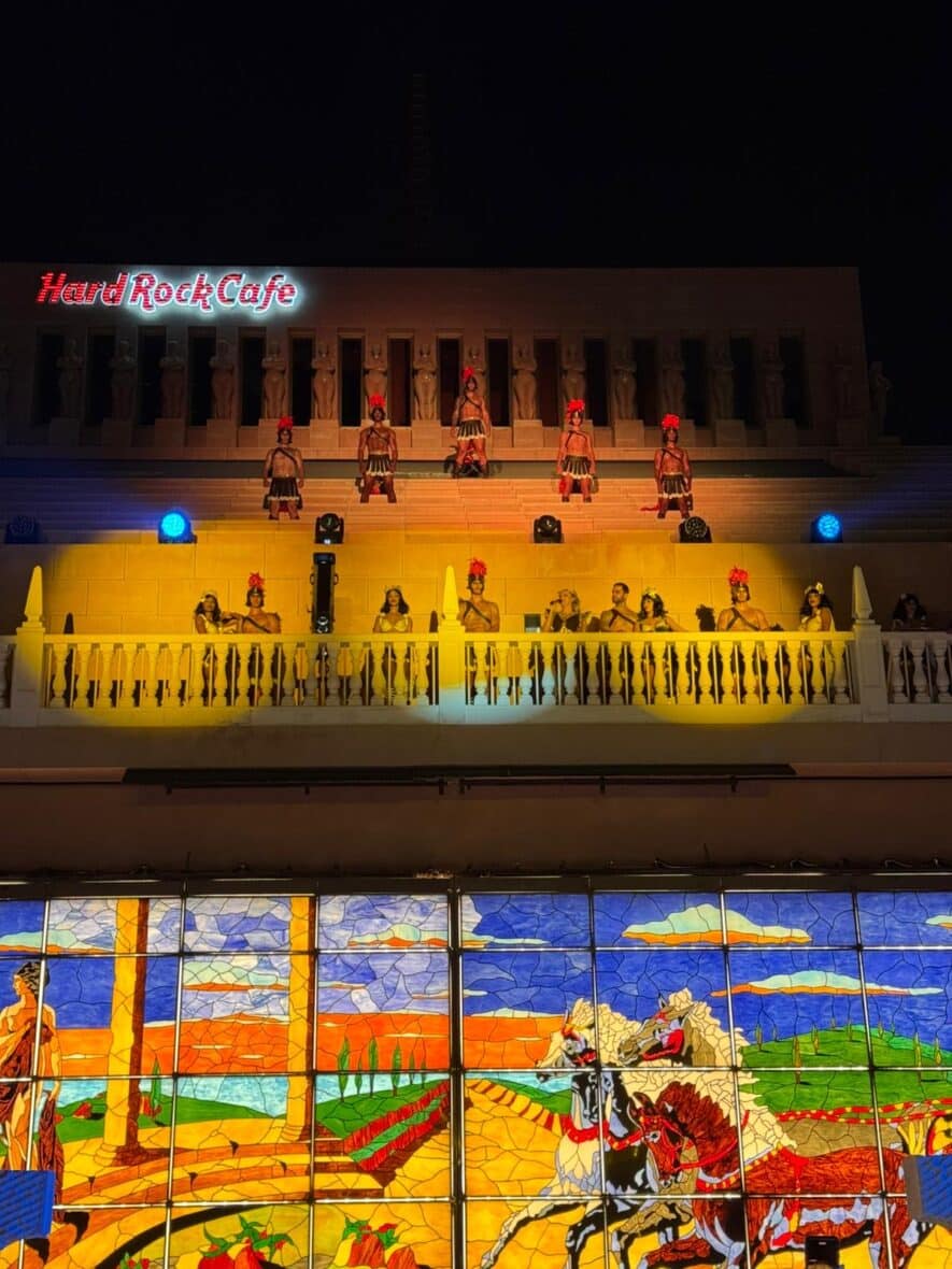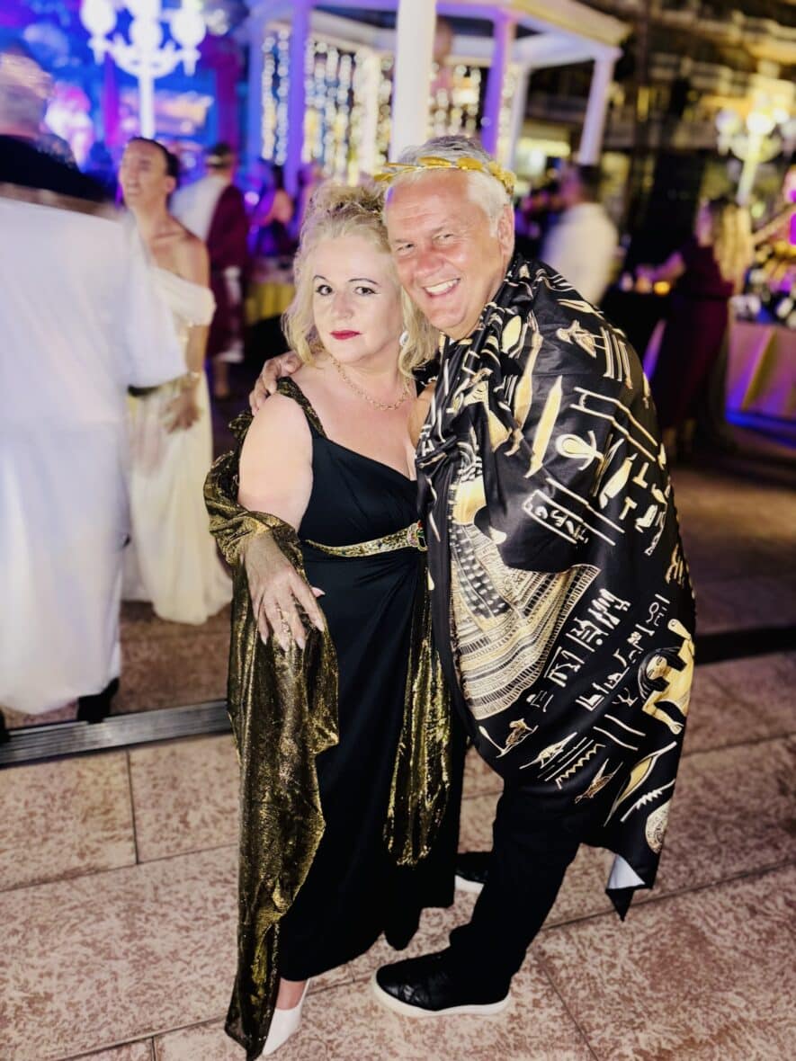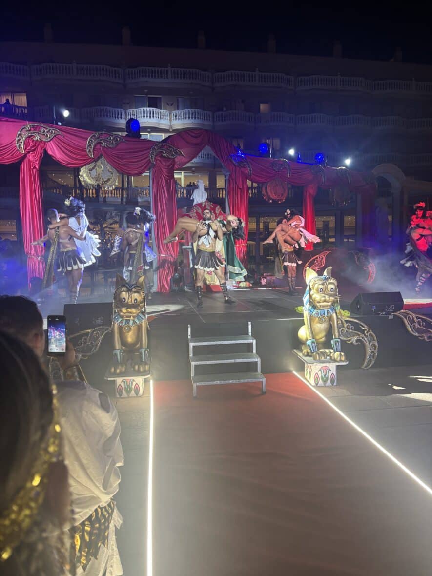 The Cleopatra hotel was the stunning setting for an extravagant night of theatre and entertainment that could have stepped right out from a Hollywood movie set. The theme was Ancient Greek and Rome complete with a dynamic cast of Gladiators, Chariots, Roman maidens Egyptian Gods and Goddesses and singers and dancers galore the show was held on the temporary stage erected by the pool area and on pedestals that were lining the red carpet.