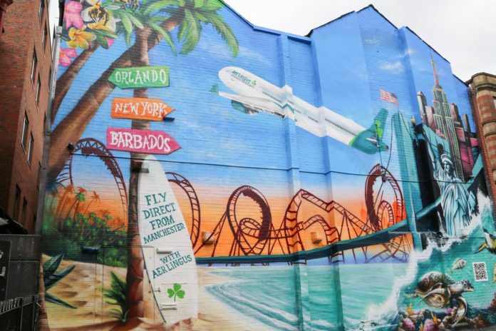Aer Lingus has teamed up with top local graffiti artist Qubek to create a massive new eye-catching street art mural showcasing the airline’s transatlantic Manchester routes.