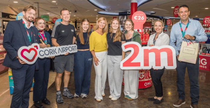 Benvon Deasy from Rochestown, Cork, who was travelling to Cape Town, South Africa via London Heathrow was greeted by airport management and presented with a special gift before departing on Aer Lingus EI722 to London Heathrow. Benvon was joined on her travels by her husband Killian and daughters Síofra, Aoibhe and Laoise. This year, Cork Airport reached its two millionth passenger milestone a full month earlier than in 2024, when the milestone was passed in late August.