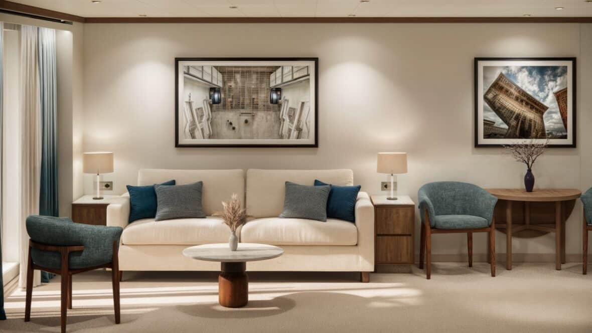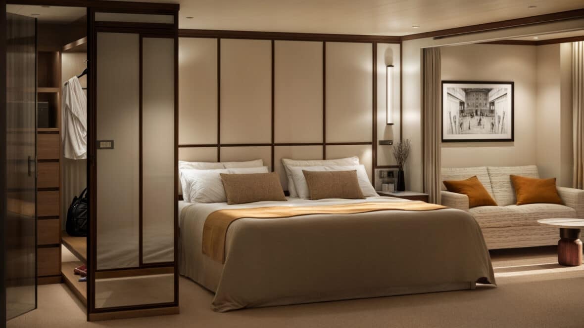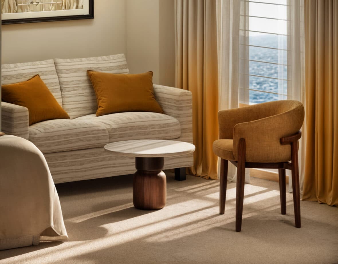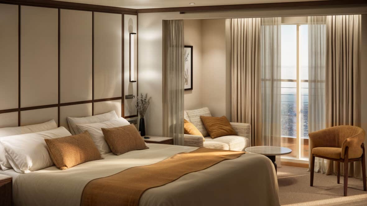 These delightful suites offer 230 sq. ft. of refined comfort, featuring a 57 sq. ft. private veranda, a comfortable living area with sofa, a walk-in shower and a built-in closet. Enhanced storage, including additional overhead compartments, ensures ease and convenience, while thoughtful design provides an intimate yet elegant retreat at sea.