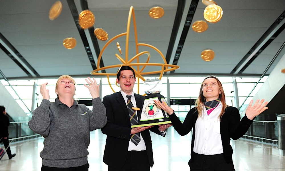 DAA employees, supported by the company and members of the public, have raised €2 million for 18 Irish charities in the past 10 years, including €300,000 for three charities in 2016. Above, daa staff members Andreea Mantea, Daniel Jordan and Denise O’Hanlon celebrating raising the €2 million.