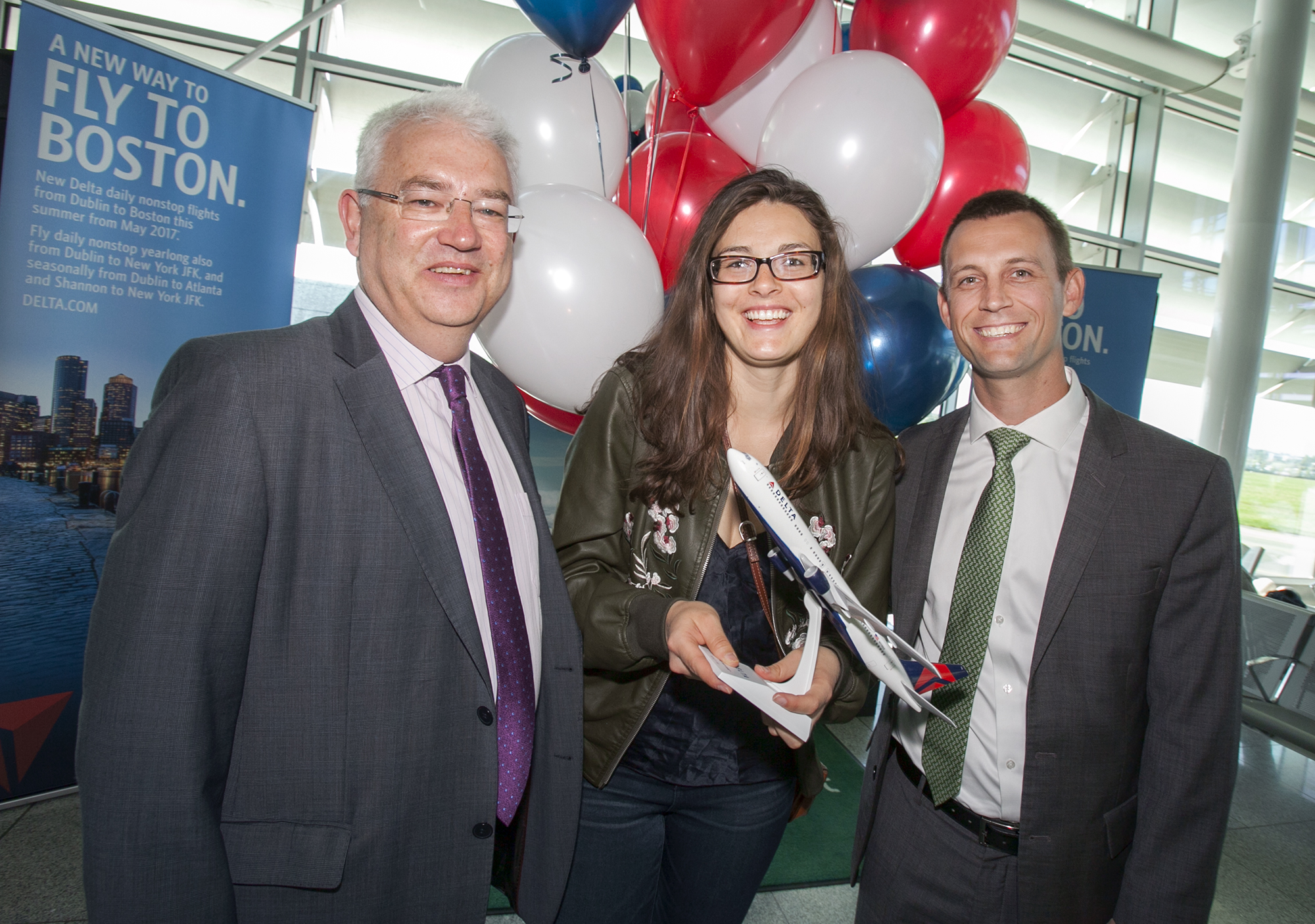 Above are Vincent Harrison, Managing Director, Dublin Airport; Rye Carroll, passenger travelling on Delta’s inaugural Dublin-Boston flight; and Alex Antilla, Director Transatlantic Network, Delta Air Lines.