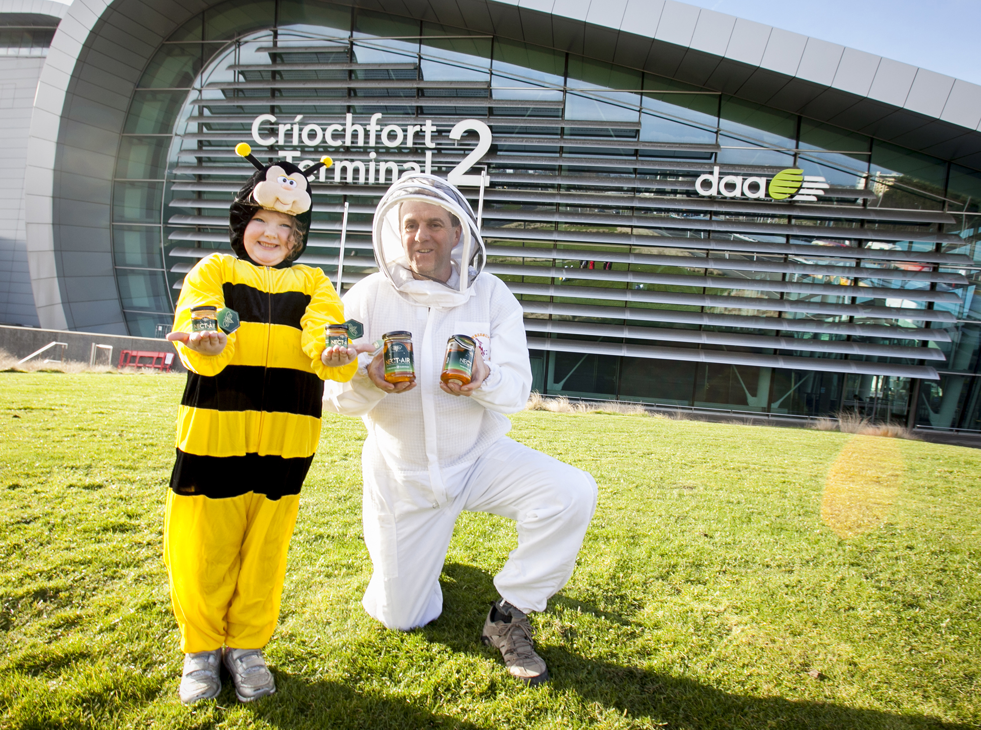 Above are Síle O’Kane (6) and beekeeper Colm Fogarty at the launch of the first batch of Dublin Airport honey, Nect-Air