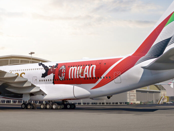 Emirates has unveiled a bold A380 livery emblazoned with Italian football club AC Milan’s trademark colours, celebrating the Rossoneri’s 125 year-legacy of excellence and generational impact on global football.