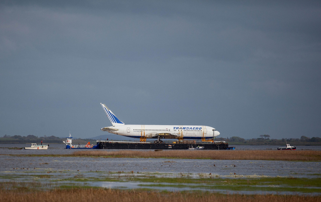 A decommissioned B767 aircraft has arrived at Enniscrone, Co Sligo, after being moved by barge on the high seas in a mammoth 36-hour exercise from Shannon Airport. The aircraft was transferred to nearby Knockbeg Point, on the periphery of the airport complex, where it was loaded on to a barge at high tide, allowing the estuary and ocean journey to begin.