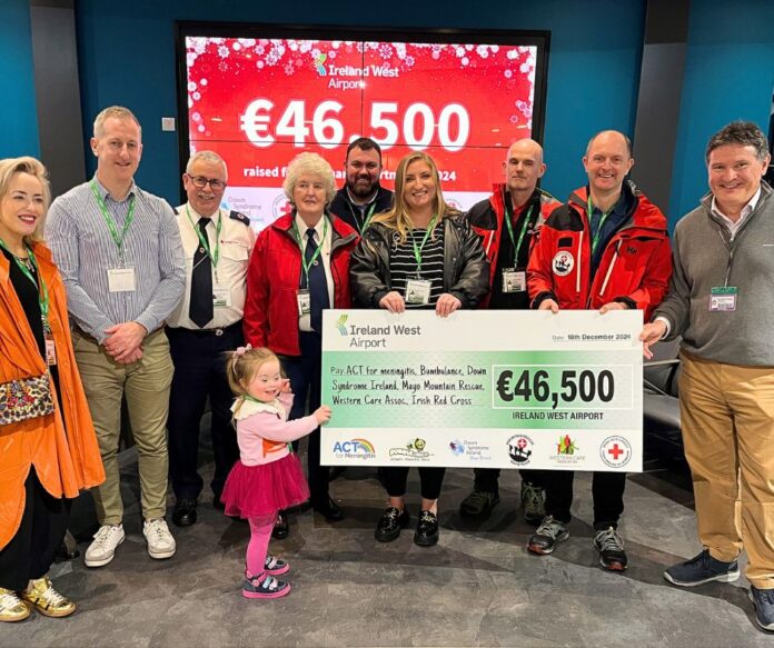 Ireland West Airport has presented a cheque for a record €46,500 to the airport’s six staff nominated charities for 2024 – ACT for Meningitis, BUMBLEance, Down Syndrome Ireland (Mayo Branch), Irish Red Cross, Mayo Mountain Rescue, and Western Care Association.