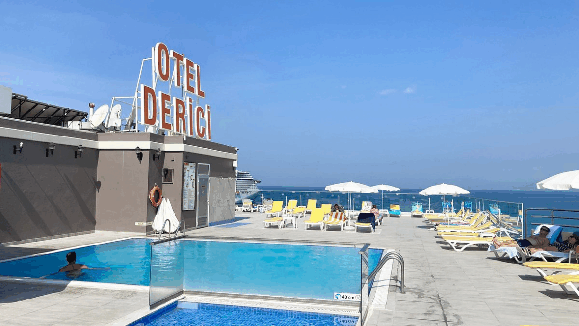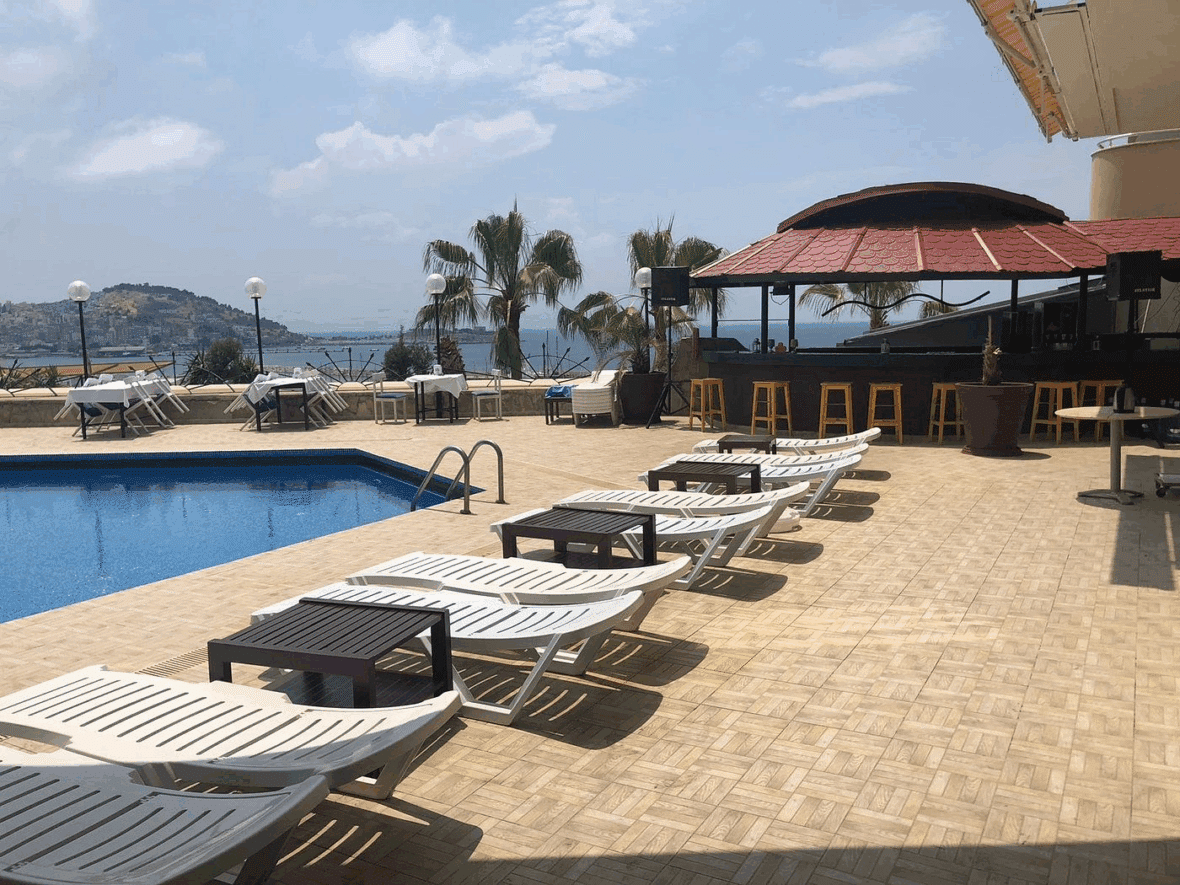 The hotel’s facilities include a large outdoor swimming pool with sun loungers, a rooftop terrace with panoramic views of the Aegean Sea, and an on-site restaurant serving a combination of traditional Turkish and international cuisine. A lounge bar and poolside café provide additional dining and relaxation options.