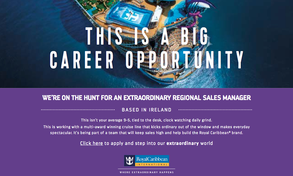 RCI says: “This isn’t your average 9-5, tied to the desk, clock-watching daily grind. This is working with a multi-award-winning cruise line that kicks ordinary out of the window and makes everyday spectacular. It’s being part of a team that will keep sales high and help build the Royal Caribbean International brand.”