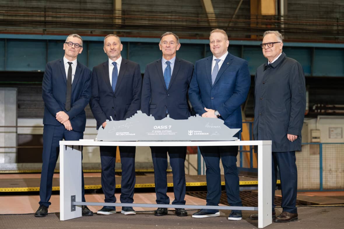 Representatives from Royal Caribbean and Chantiers de l’Atlantique attended the milestone event to commemorate the moment alongside the teams of innovators, naval engineers, architects, designers and more working to bring lucky number seven to life.