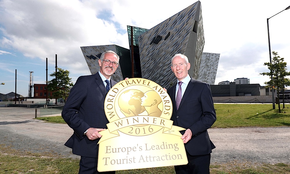 Conal Harvey, Vice-Chairman, and Tim Husbands, Chief Executive, celebrate as Titanic Belfast is named as Europe’s Leading Visitor Attraction at the World Travel Awards held in Sardinia, Italy.