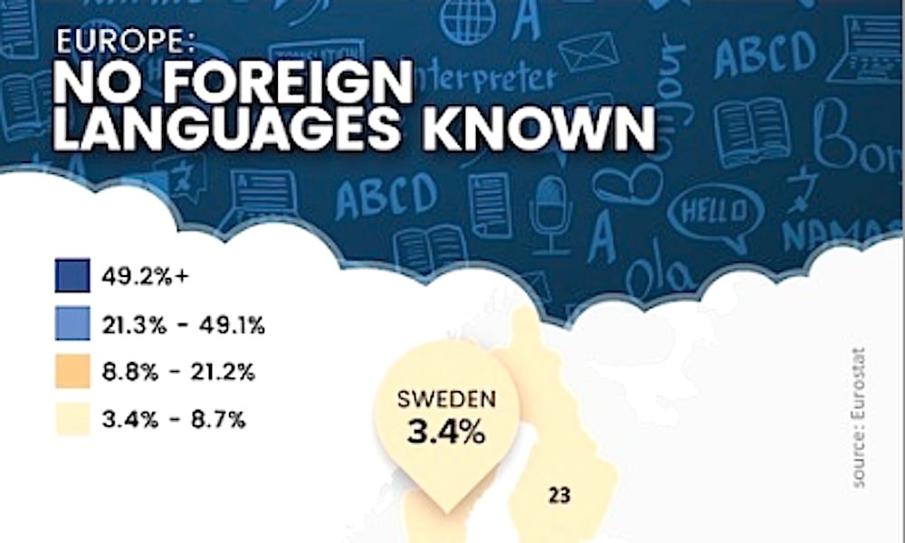 Comparably, Sweden, at 3.4%, has the lowest percentage of people who can’t speak any other language, closely followed by Denmark (4.2%), Latvia (4.2%), Lithuania (4.5%), and Luxembourg (5.5%).